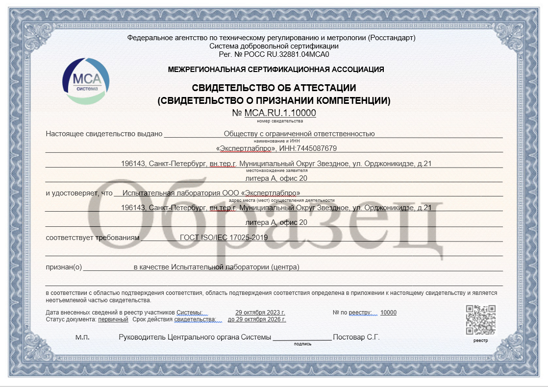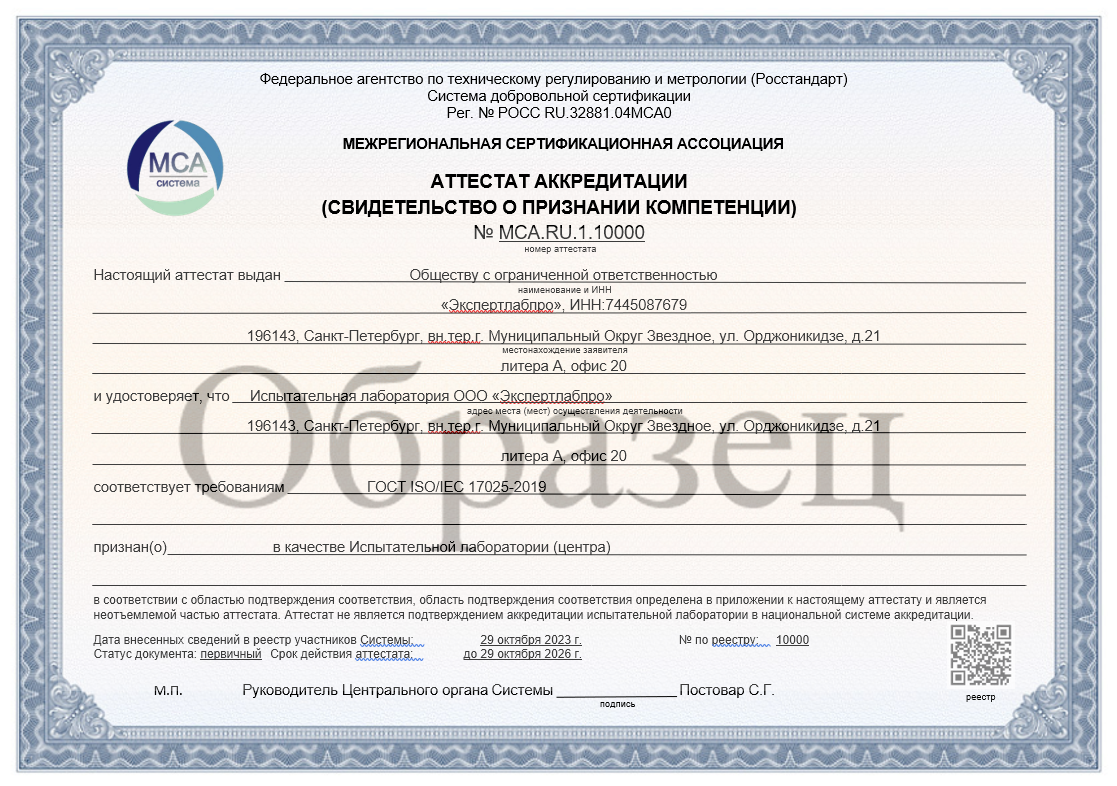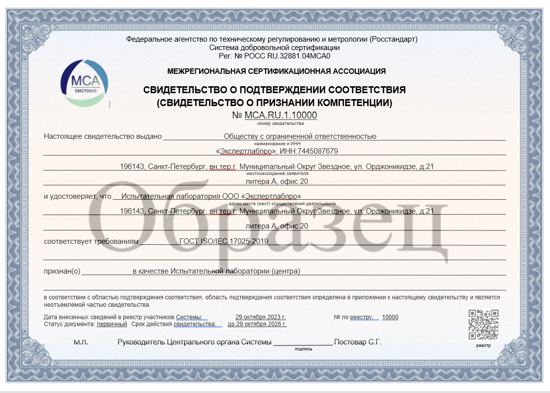 в Системе сертификации «Межрегиональная Сертификационная Ассоциация» (сокращенно СДС "МСА система") на соответствие стандарту ГОСТ ISO/IEC 17025-2019 "Общие требования к компетентности испытательных и калибровочных лабораторий".